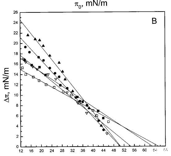 通过测量表面压力的增量,观察到抗菌肽在不同初始表面压力(π0)下嵌入到空气/水界面上的脂质单层中(∆π)将肽添加到亚相后(Brockman,1999;Verger和Pattus,1976)。Magainin 2在π0>12 mN/m时容易插入SOPC单层(图1A),而在π0以上≈35 mN/m时,其在膜中的渗透被消除,因此该值表示该肽与SOPC膜相互作用的临界包装压力πc。根据其净正电荷4(Matsuzaki,1998),当膜中酸性磷脂POPG的含量增加时,magainin 2向脂质单层的渗透逐渐增强(图1 A)。因此,消除magainin 2插入单层的πc值增加至~39(XPG=0.1)、43(XPG=0.2)和46 mN/m(XPG=0.4)(图1c)。相反,在SOPC膜中加入胆固醇(Xchol=0.1)对magainin 2的渗透没有显着影响(图1A)。