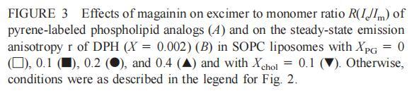 有趣的是,在存在酸性磷脂的情况下,肌动蛋白/脂质的摩尔比(在该摩尔比下,肌动蛋白的初始增量趋于稳定)分别为1:21、1:16和1:12.5,对应于XPG=0.1、0.2和0.4(图2A),分别产生1:2、1:3和1:5的肌动蛋白/磷脂化学计量比。同时,DPH的初始r增量在magainin/脂质摩尔比为~1:30、1:12和1:5时趋于平稳(XPG分别为0.1、0.2和0.4),对应于大约1:3、1:2.5和1:2的magainin/PG化学计量比(图3)。据报道,在这些肽/脂质摩尔比下,magainin可插入含酸性磷脂的膜中(Ludtke等人,1994年)。此外,已经证明,双分子层中magainin的=-螺旋的方向取决于肽与脂质的摩尔比,在上述化学计量比下,螺旋应垂直于膜表面插入,在含PG的膜中形成孔(Ludtke等人,1996)。这些孔不仅由两亲螺旋的极性面组成,而且还由脂质的极性头基组成,内外单层通过这些孔衬脂质是连续的。膜中的这种结构可能会降低探针芘部分微环境的极性,从而提高其量子产率。有趣的是,当XPG>0.1时,magainin 2逐渐降低Ie/Im值(图3 A),这与增强的酰基链顺序减少脂质侧向扩散的速率一致。然而,由于magainin 2已经在XPG=0.1时增加了r,Ie/Im没有变化,XVDEVIOS官方下载免费版可以得出结论,PPDPG探针向微区富集以及其横向扩散的减少正在发生。