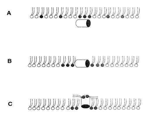 对于测试的所有单层组成,吲哚青霉素的πc值超过了马盖宁2的测量值(图1 c),表明该肽在酰基链之间有效插入和插层。吲哚西丁在~38 mN/m的交叉点值得关注。在后一个表面压力之下,表面压力的增量∆?在PG存在的情况下,吲哚西丁引起的反应增强,而在较高的初始脂质堆积密度下观察到相反的反应。有趣的是,不管脂质成分(即PG的存在)如何,交叉点几乎保持不变,因此表明它可以完全由表面压力决定,而不管静电相互作用如何。一种可能的机制是,在π0>38 mN/m时,吲哚西丁以压力依赖的方式改变其在单层中的取向,可能是从其长轴相对于层平面的平行到垂直取向(图9,B和C),从而减少面积/肽并减少∆π.此外,一些静电结合吲哚肽的PG分子也可能与单层中的磷脂方向不同。换句话说,吲哚西丁与其相关的PG将形成一种超分子复合物,其取向将取决于压力。这在图9中示意性地示出。重要的是,所提出的肽连接磷脂的重新定向将与最近提出的模型兼容,在该模型中,穿过双层的孔表面的一部分将由脂质头基构成(Ludtke et al.,1996)。