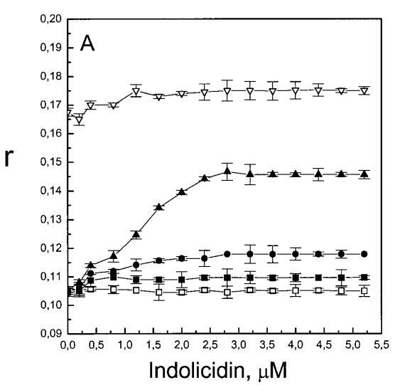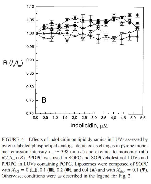 虽然荧光光谱显示,马盖宁2和吲哚西啶对脂质动力学的影响存在明显差异,但也存在一些明显的相似之处。因此,DPH各向异性r的增加表明,在存在酸性磷脂的情况下,这两种肽都会导致酰基链顺序的增加,这种影响的程度随着XPG的增加而增加(图3b和5b)。同样,在胆固醇存在的情况下,两种肽对芘荧光的有效猝灭也很明显(图2a和4a)。这可能与胆固醇的OH基团和马盖宁的E19残基之间的相互作用有关(Tytler等人,1995年),该肽在膜中具有跨膜取向。当Xchol=0.1时,r值的增加是由于吲哚西丁所致,而马加宁则无影响。这表明,在胆固醇存在的情况下,吲哚肽可能采用跨双层取向,其长轴垂直于双层平面。