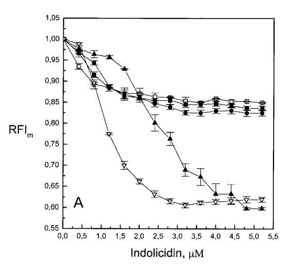 这两种抗菌肽对芘标记的磷脂类似物的猝灭机制令人感兴趣。可能涉及π-阳离子相互作用(Dougherty,1996),后者由肽的碱性残基表示。吲哚西丁具有较高的Trp含量(39%),可促进其分配到脂质双层(Wimley和White,1996)。因此,芘和色氨酸之间的π-相互作用也是可能的。已经证明,色氨酸可以淬灭胶束溶液中各种芘衍生物的荧光发射(Encinas和Lissi,1986;Altamirano等人,1998)。另一种可能性是链反转(Holopainen et al.,1999),通过肽与脂质双层结合,导致芘部分调节到更极性的环境中,从而增加荧光团微环境的极性,并导致量子产率降低。