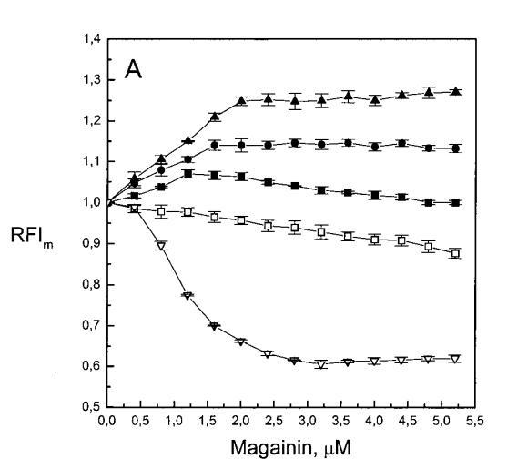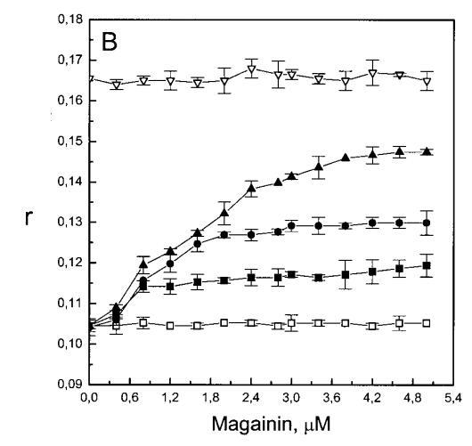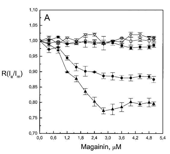 除上述相似性外,当使用芘标记的脂质类似物研究酸性磷脂对脂质动力学的影响时,两种肽之间也存在明显差异。Magainin 2导致两性磷脂组成的LUV的芘发射显着猝灭(图2A)。然而,在PG存在的情况下,芘的单体强度增加,XPG逐渐增加了这种效应的幅度(图2A)。圆二色性、拉曼光谱、傅里叶变换红外光谱和固态核磁共振研究表明,马盖宁在与脂质双层结合时采用螺旋构象(Matsuzaki等人,1989年、1991年;Williams等人,1990年;Jackson等人,1992年;Bechinger等人,1993年;Wieprecht等人,1997年;Hirsh等人,1996年)。magainin 2对两种膜的这些不同影响可能是由于1)通过与肽的带正电基团(例如赖氨酸的?氨基)直接接触使芘荧光猝灭,或2)插入双层的=-螺旋肽改变荧光团的微环境,与层平面平行,如上所述。然而,在PG存在的情况下,肽的正电荷应在与酸性磷脂形成静电复合物时被中和,从而减少由于π-阳离子相互作用导致的芘荧光猝灭。