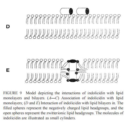 吲哚西丁只含有13个氨基酸,因此太短,无法跨越双层。然而,该肽可以作为聚集物或带有相关酸性磷脂的头尾二聚体横跨双层(图9 E),从而导致膜不稳定性。已经证明,吲哚西丁能够通过穿过外膜杀死革兰氏阴性细菌,并通过形成通道破坏细胞质膜(Falla et al.,1996)。与magainin 2的作用相比,吲哚青霉素诱导的内吞小泡较小(图7)可能反映了这些肽与脂质相互作用的不同模式。一些吲哚肽分子可能会转移到膜的内部小叶中。除了具有广谱的抗真菌和抗菌活性外,吲哚西丁对哺乳动物细胞也有毒性(Schluesener等人,1993年;Ahmad等人,1995年)。有趣的是,吲哚西丁对SOPC和SOPC胆固醇巨型脂质体的作用不同。在这一阶段,根本原因尚不确定,可能与胆固醇对双层结构以及吲哚肽在膜中的取向的影响有关。因此,需要进一步的研究来阐明胆固醇对吲哚肽膜结合的影响。