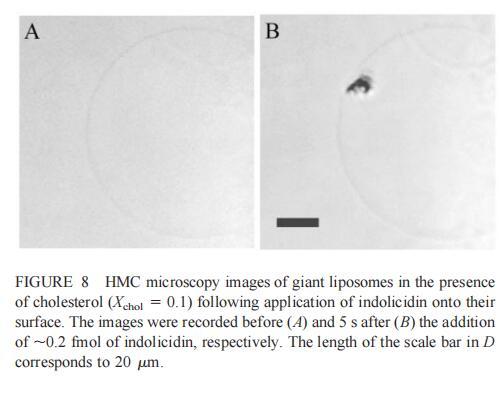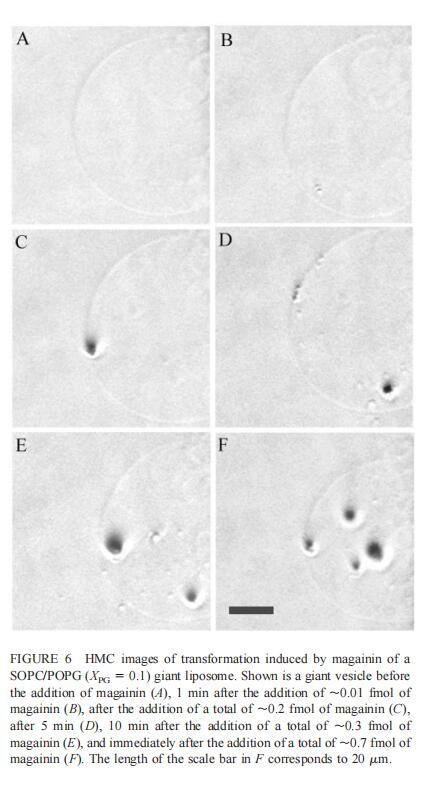 由于上述magainin 2和吲哚西啶对单层和LUV具有明显的脂质成分依赖性作用,因此有兴趣使用巨型脂质体比较这些肽对宏观膜的三维拓扑结构的影响,无论是否含有PG,都可以在交流电场中形成由SOPC组成的巨大脂质体。即使暴露于大量肽(~2 fmol,~4 pl=200次重复注射,数据未显示),SOPC膜也不受magainin 2的影响。同样,由SOPC和胆固醇(Xchol=0.1)组成的巨大脂质体也不受此量的马盖宁2的影响(数据未显示)。然而,在存在POPG(XPG=0.1)的情况下,已经~0.01 fmol(单次~20 fl注射)的magainin 2应用于巨大囊泡表面,显着影响巨大脂质体膜的拓扑结构(图6 B)。更具体地说,在~1分钟内,小颗粒(θ≈0.9米)出现在巨大的囊泡内。随后注射高达~0.1 fmol(约200 fl)的magainin 2不会引起进一步的可见变化。在总共添加约0.2 fmol的肽后,膜开始起伏,形成致密颗粒(θ≈4 m)在巨大脂质体内可见(图6 C)。在~5分钟内,几个小颗粒(θ≈0.9 m)出现在巨大脂质体膜的内表面(图6 D)。随后,大多数小颗粒进入巨大囊泡的内腔。这些内吞小泡似乎在巨大脂质体内自由移动,在随后30分钟的观察中没有进一步的变化。进一步注射magainin 2,提供总共0.3 fmol的肽,引起类似内吞作用的过程,出现直径约8 m的致密颗粒(图6 E)。约10分钟后,巨大脂质体内约0.9-m颗粒的数量继续增加。偶尔,这些颗粒也出现在巨大囊泡的外表面,并释放到外部缓冲液中(图6 E)。随后添加magainin 2(~0.7 fmol)使膜不稳定并诱导进一步的囊泡形成(图6 F)。这些内吞囊泡在巨大脂质体内彼此分离,巨大囊泡的大小明显减小(图6f)。最终,在进一步添加magainin 2(高达~1.5 fmol)后,巨大的脂质体膜崩塌。上述形态学变化具有高度的可重复性。
