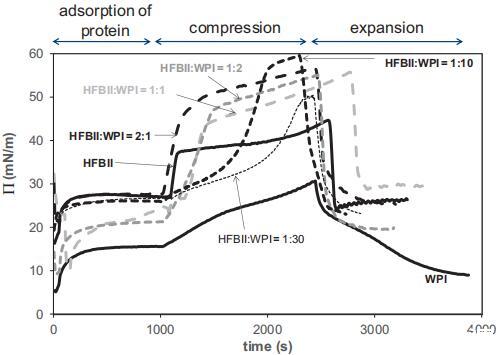 值得注意的是,对于纯HFBII,П–A等温线在连续的压缩膨胀循环中不会发生变化,这再次表明HFBII不可撤销地附着在界面上,几乎没有任何构象变化。对于纯WPI和1:1混合物,П–A等温线略微向较小区域移动,这表明由于WPI分子的构象变化、多层形成或如前所述,由于WPI的解吸,表面重排的可能性较小。