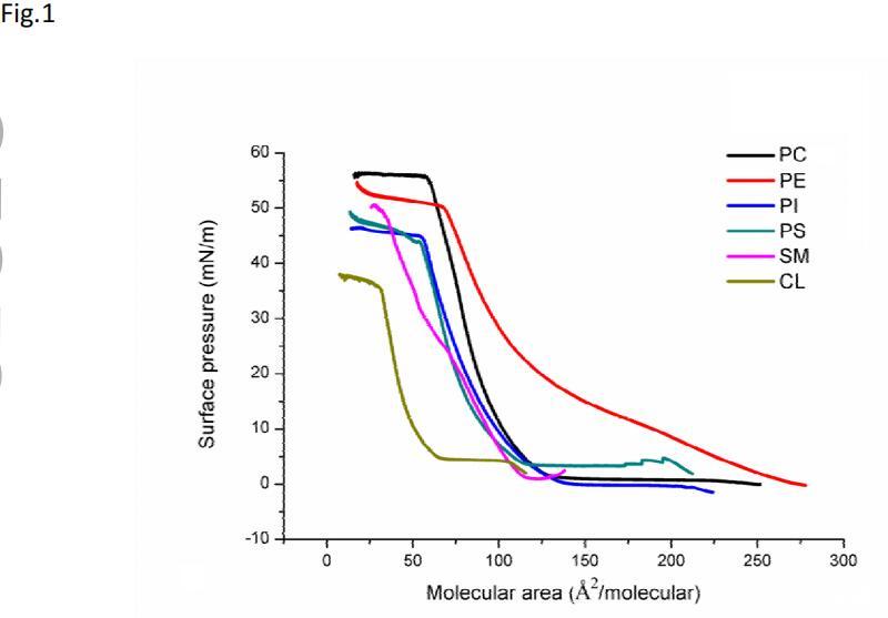 图1显示了空气-水界面上不同磷脂单层的π-A曲线形状。这里测试的所有磷脂的π-A曲线的形状都是在所有显示的表面压力下单一液体膨胀(LE)和液体冷凝(LC)状态的特征。在压缩时,单层经历了一个转变,这被视为从LE(低于10 mN/m)到LC状态的转变。在高分子区域,由于分子堆积的增加,表面压力升高,但不改变单层膜的弹性。最后,单分子膜达到了一种更为浓缩的状态,但在π-a等温线的形状中没有明显的崩塌点。对于这里测试的磷脂,它们都可以形成稳定的膜,并表现出良好的压缩性能,DOPC的表面压力甚至达到57 mN/m。
