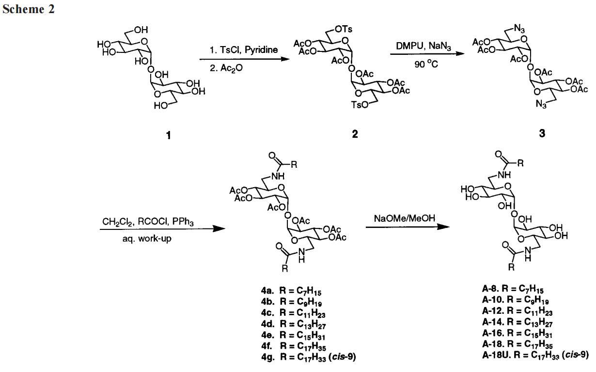 2,3,4,2′,3′,4′-六邻乙酰基-6,6′-二十八胺基-6,6′-二脱氧-r,r-D-海藻糖,4a。按照上述一般程序,2.1 g(3.3 mmol,6.5 mmol当量)3,50 mL CH2Cl2和2.7 mL(9.8 mmol)辛酰氯,以及2.4 g(9.2 mmol)PPh3与15 mL CH2-Cl2反应。黑色固体被过滤,留下栗色溶液。洗涤和干燥后,对所得棕色糖浆进行色谱分析,得到2.2 g(80%)4a,白色固体,mp 70-72°C。