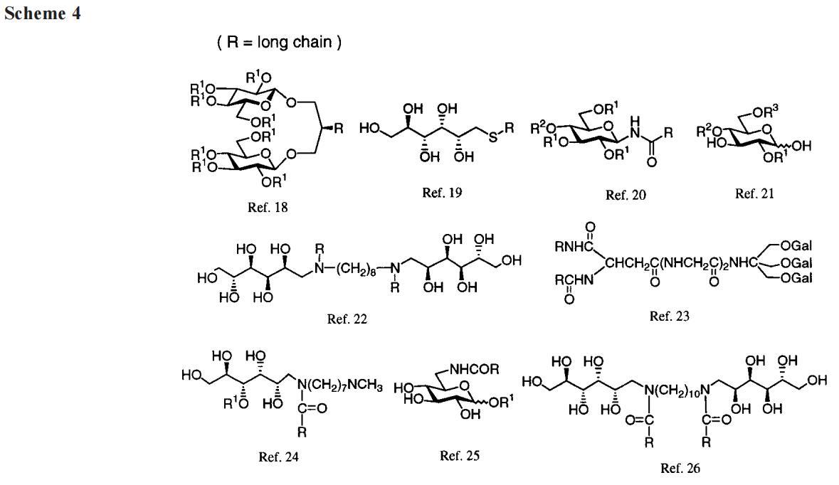 接下来,XVDEVIOS官方下载免费版提出了在海藻糖衍生物上放置阳离子基团以改善其水溶性的想法。必须承认,XVDEVIOS官方下载免费版对更易管理的水溶性化合物的前景感到一定程度的高兴。B系列就这样出现了。然而,XVDEVIOS官方下载免费版立即面临新的问题。虽然B-12和B-14是作为纯化合物获得的,但B-16和B-18并非如此。后两种Gemini的产率较低,提供了令人满意的光谱数据,但它们的元素分析偏离了理论1-2%(这使XVDEVIOS官方下载免费版怀疑存在无机杂质)。无论如何,由于B-16和B-18不符合XVDEVIOS官方下载免费版的高纯度标准,XVDEVIOS官方下载免费版在注意力上轻视了它们,而偏爱它们的矮表亲。