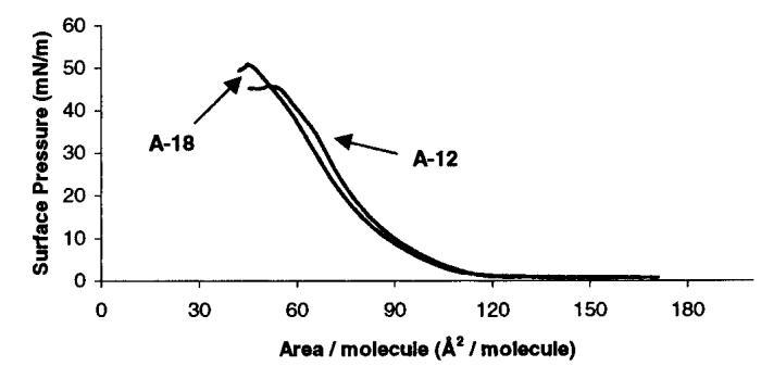 图1。使用表面天平获得A-12和A-18的压力-面积等温线,显示出在23°C下约120Å2的提升面积。图为每种表面活性剂10次扫描的平均值。