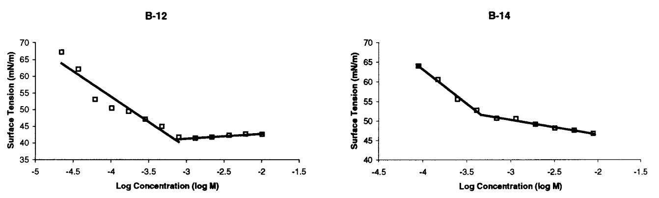 图4。室温下测定B-12和B-14临界胶束浓度的张力测定图。B-14混合后立即进行测量,而B-12样品老化20分钟。