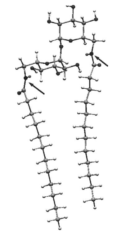 图6。A-12最低能量构象的宏观模型快照,显示了双层形成两亲分子的管状结构特征。箭头表示酰胺氮(N-to-N距离)7.4Å)。