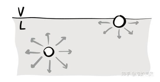 即,对于体相中的分子,其所受斥力在各方向均等大反向;而对于位于表面的分子,粒子之间的排斥力从(气相中的)忽略不计,在经过几个分子层后,迅速增加到体相的强度。在这一增加过程中,由于排斥力的各向同性本质,其在任一位置的强度在各个方向是一样的。
