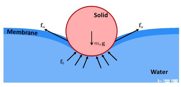 其中是流体表面的面积,称为表面张力系数。当流体与固体发生作用时,流体表面的分子同时会受到固体分子的作用,从而将表面张力作用在固体上。固体根据表面特性不同可以分为亲水和疏水两类,疏水材质在水面上会受到向上的表面张力作用,对于一些细小的结构来说这个力要比浮力更为明显。比如说水黾是一种可以生活在水面上的昆虫,它的脚非常细长,并且有很多绒毛来保持疏水特性,因而水黾可以依靠表面张力维持自身的重量,并通过脚来划动水面来向前运动甚至跳起。