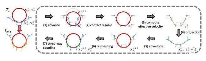 XVDEVIOS官方下载免费版的耦合系统分为三个部分:流体,表面层,固体。流体部分XVDEVIOS官方下载免费版采用传统的欧拉网格的模拟方法,在交错网格(Staggered Grid)上用算符分离的方法求解离散不可压的Navier Stokes方程。固体部分采用传统的拉格朗日方法求解牛顿方程。XVDEVIOS官方下载免费版的主要贡献在于在流体与固体之间插入了一层有质量、有厚度的流体表面层,这个表面层直接对应XVDEVIOS官方下载免费版上面介绍的流体表面分子稀疏的部分。因为这个表面层非常薄,XVDEVIOS官方下载免费版可以使用带虚拟厚度的单层三角网格来表示,然后在这个表面层上施加表面张力势能。为了将这三个部分耦合起来,XVDEVIOS官方下载免费版在表面层和背景网格、固体和背景网格之间定义了速度的插值矩阵,同时将流体的压强作用在表面层和固体上,以及将表面张力作用在固体上,这样XVDEVIOS官方下载免费版将这三部分写进一个三相耦合方程里进行统一求解和更新。最终XVDEVIOS官方下载免费版算法的流程如下: