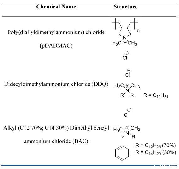 试剂和样品制备。pDADMAC,Mv=8.5 kDa,作为28 wt%的水溶液从Poly Sciences Inc.获得,pDADMAC,Mv=21和140 kDa,分别作为35和20 wt%的溶液从Sigmaldrich获得。DDQ从Lonza(商品名-Lonza Bardac 2240)获得,并以40 wt%的水溶液形式收到。BAC从Thor(商品名-Activide BAC 50 M)获得,并以50 wt%的水溶液形式接收。通过在80°C的真空烘箱中干燥,通过重量法验证上述储备溶液的浓度,直到未记录进一步的质量损失。每个样品进行三次重复测量,并记录平均结果。除非另有说明,否则表面活性剂和聚电解质均按原样使用,无需进一步纯化(表1)。
