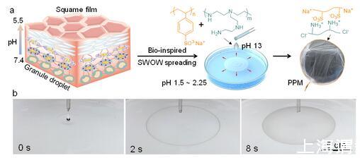 图1受皮肤分化过程启发的水-水铺展与聚电解质膜制备机制
