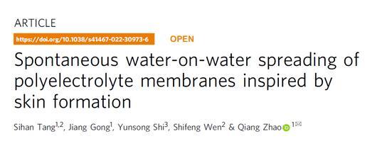近期,赵强教授课题组在《Nature Communications》在线刊发了该领域的新进展(Spontaneous water-on-water spreading of polyelectrolyte membranes inspired by skin formation,Nat.Commun.13,3227,2022.),提出了一种聚电解质水溶液在水面自发铺展,形成多孔膜的机制。文章第一作者是化学与化工学院2020届硕士毕业生汤思晗,合作单位包括华中科技大学材料科学与工程学院,协和医院。研究得到国家自然科学基金,国家重点研发计划和三峡实验室开放基金的支持。