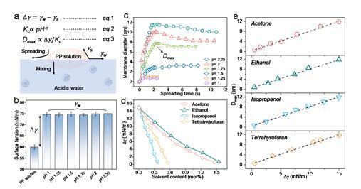 含有聚乙烯亚胺(PEI)和聚苯乙烯磺酸钠(PSSNa)的水溶液滴在水表面自发铺展成膜(图1,图2)。一般而言,水溶液液滴与水接触时首先发生向水中的扩散与混溶,而非铺展。为了抑制水-水扩散与混溶,作者设计了PEI-PSSNa和混合溶液,其pH为碱性。当该溶液液滴与酸性水接触时,水中含有的大量质子促使PEI高分子链上的氨基质子化,随后带正电的PEI与PSSNa在水-水界面上发生静电络合,有效抑制了溶液向水中的扩散与混溶。与此同时,PEI-PSSNa的表面张力比水低,液滴因此在水表面可自发铺展,而非混合。二者协同,促使了水溶液液滴在水面进行自发铺展。