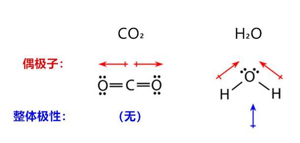 如果分子是由两个以上原子组成,在确定分子是极性还是非极性时,还必须考虑分子的几何形状。下图显示了二氧化碳分子与水分子之间的比较,二氧化碳是线性分子,偶极子因强度相同方向相反而互相抵消,对外显示整体分子的极性为零;水分子的两个极性键有夹角,因此整体对外显示出极性。