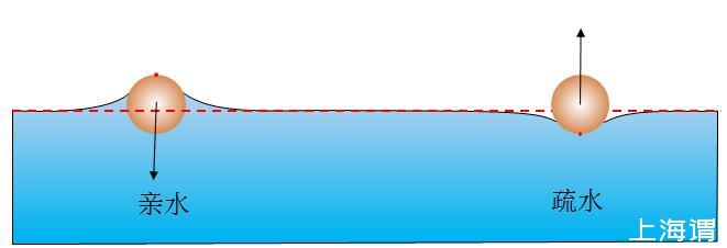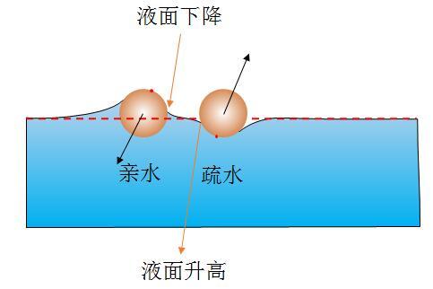 亲水的使疏水的固体附近液面没那么低,疏水的使亲水的物体附近液面没那么高,表面为相互排斥。