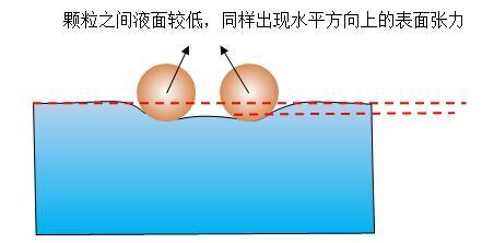 这时,让两个亲水的物体缓慢靠近,当一个处于另外一个的毛细作用力范围时,由于毛细作用的相互耦合作用,两个球形颗粒之间的液面会比两侧要高,这就打破了原来每个球形颗粒所受液体表面张力的对称性,使表面张力的合力不再是垂直向下。出现了水平方向的分力,表现为相互吸引,如图3。
