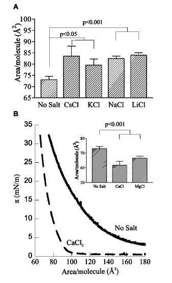 图3:。各种反离子的影响。(A)用250 mM盐缓冲HEPES亚相上的L-R PIP2在π)30 mN/m处的每分子面积;平均值(SE,n)5。(B)π-L-R PIP2 HEPES缓冲亚相的面积等温线,pH 7.4,30°C(实线),相同条件加250 mM CaCl2(虚线);(插图)250 mM CaCl2和MgCl2影响的量化;平均值(SE,n)4。