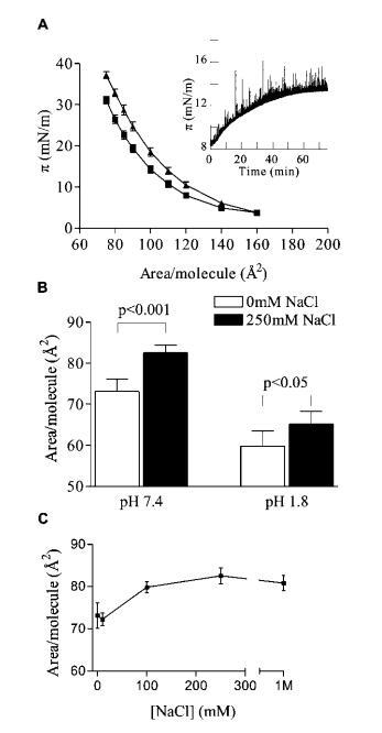 图1:。NaCl对PIP2单分子膜的扩张效应。(A)π-含0 mM(9)和250 mM NaCl(2)的等温线;(插图)亚相注入250 mM NaCl(时间)0时,恒定面积/分子的表面压力变化。(B)在pH 1.8(n)7)和pH 7.4(n)5)条件下,30 mN/m的每个分子的面积。(C)对亚相NaCl的剂量反应。误差条为平均值(n处为SE)5,除非另有说明。所有数据均为HEPES缓冲亚相的L-R PIP2,pH 7.4(除非另有说明),30°C。