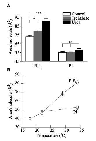 图4:。水介导分子间氢键的证据。HEPES缓冲亚相上的L-R PIP2和L-R PI在π)30 mN/m时的每分子面积,pH 7.4(A)存在5 mM海藻糖和5 m尿素,(B)作为亚相(O)PIP2温度的函数;0)PI)。
