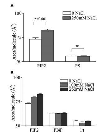 图2:。盐膨胀效应对PIP2的特异性。(A)L-R PIP2和L-R PS的每分子面积;和(B)HEPES缓冲亚相上的L-R PIP2、L-R PI(4)P和L-R PI,pH 7.4,π)30mN/m下的30°C。平均值(SE,n)4。