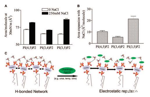 图5:。亚相氯化钠膨胀效应的PIP2异构体特异性。(A)HEPES缓冲亚相上的DO-PIP2异构体在π)30 mN/m时的每分子面积。平均值(SE,n)7。(B)250 mM NaCl和无亚相NaCl之间DOPIP2异构体的每分子面积差异。通过双向ANOVA测量,NaCl效应的异构体依赖性显着达到p)0.0001。(C)PIP2分子间相互作用的概念动画。在没有潮向性试剂(绿色椭圆)的情况下,PIP2分子形成水介导的氢键网络。当添加潮向性聚合物时,网络被破坏,带电磷酸盐之间的静电排斥导致单层的膨胀。