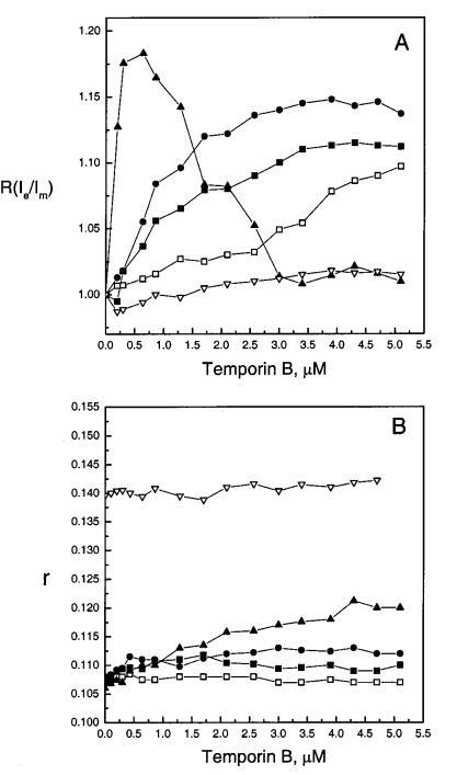图3:通过芘标记的磷脂PPDPC(X)0.01)的荧光和DPH(X)0.002的稳态发射各向异性r评估颞叶素B对LUV中脂质动力学的影响,显示为具有XPOPG)0(0)、0.10(9)、0.20(B)和0.40(2)的SOPC脂质体中归一化准分子与单体比率r(Ie/Im)(图A)和各向异性r(图B)的变化,Xchol)0.10(3)。每个数据点代表三次测量的平均值。标准偏差小于0.02(面板A)和0.004(面板B),为清楚起见,未显示。否则情况如图2图例所示。