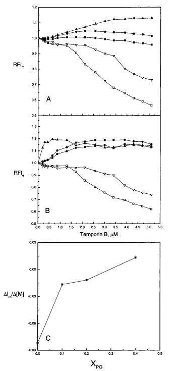 颞蛋白对双层脂质动力学的影响。随后通过记录掺入LUVs的芘标记荧光磷脂类似物PPDPC(X)0.01)的发射光谱来研究肽与脂质体结合的后果。对于含有脂质类似物(如PPDPC)的单个芘部分,稳态Ie/Im值反映了膜中荧光团的横向迁移率和局部浓度(18,19)。然而,XVDEVIOS官方下载免费版之前的研究比较了两种其他抗菌肽(马盖宁2和吲哚肽)对膜脂质动力学的影响,发现这些肽也影响芘标记脂质的量子产率(15)。对于SOPC LUV,添加temporin B分别导致芘单体和准分子发射Im和Ie的显着减少,最大减少约40%(图2,面板a和B)。芘荧光带的猝灭是双相的,当时间蛋白B与脂质的摩尔比约为1:12时,量子产率显着降低(图2,面板a和B)。在胆固醇(Xchol)0.10)存在的情况下,temporin B对芘单体和准分子荧光的猝灭也很明显,尽管发射的减少量小于在SOPC LUV中观察到的减少量(图2,面板A和B)。然而,当酸性磷脂POPG存在于XPOPG)0.10时,Im中只有微不足道的变化是明显的,当XPOPG从0.20增加到0.40时,时间蛋白B导致Im以渐进的方式增加,Im的初始增量在大约2/1的POPG/时间蛋白B化学计量比下趋于稳定。在达到饱和响应之前,Im中线性增量的斜率随着XPOPG而增加(图2,面板C)。在POPG存在的情况下,颞蛋白B也增加了Ie。在XPOPG)0.40时,Ie的值逐渐增加,直到颞蛋白B:脂质摩尔比为≈1:15,对应于≈1/6,而当超过该化学计量比时,Ie降低。图3,面板A中显示了由于颞蛋白B引起的Ie/Im的变化。具体而言,SOPC LUV的Ie/Im增加了1.1倍,而在胆固醇(Xchol)0.10的存在下,观察到Ie/Im的微小变化,面板A)。将XPOPG从0.10增加到0.20会逐渐增强Ie/Im的增量。有趣的是,在XPOPG)0.40时,当时间蛋白B:脂质摩尔比为≈1:30.然而,在这一肽:脂比之上,颞叶素B导致Ie/Im降低,而在这一肽:脂比之上,Ie/Im的变化不显着≈1:6.