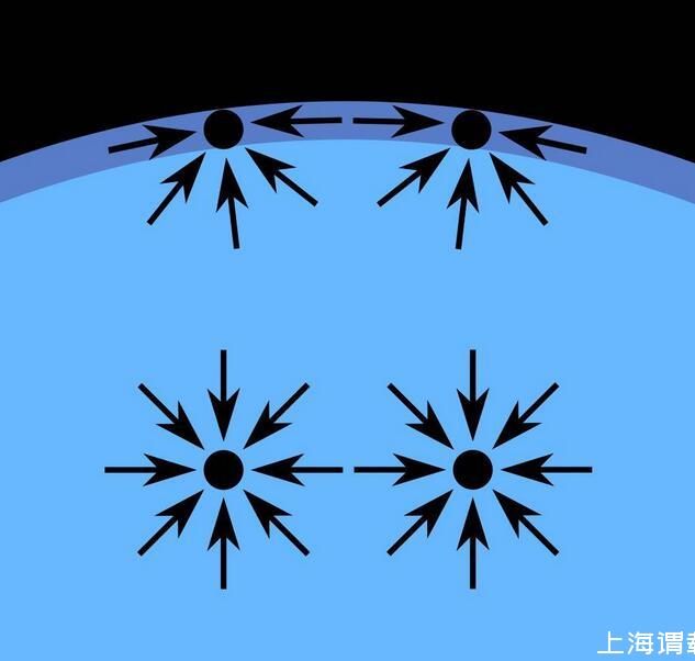 表面张力是流体表面存在的可能收缩到最小表面积的趋势力;它是液体分子由于凝聚力相互吸引而在其表面形成的内向力;它就像是一张覆盖在液体表面被拉伸的弹性薄膜,可以承受一定重量的外在压力。