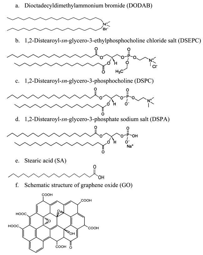正电荷脂质二十八烷基二甲基溴化铵(DODAB)和1,2-二硬脂酰-sn-甘油-3-乙基磷酸胆碱氯化盐(DSEPC)、中性电荷两性脂质1,2-二硬脂酰-sn-甘油-3-磷酸胆碱(DSPC)和负电荷脂质1,2-二硬脂酰-sn-甘油-3-磷酸钠盐(DSPA)购自Avanti Polar Lipides(Alabaster,AL)。硬脂酸(SA)购自SigmaAldrich(密苏里州圣路易斯)。由于头部基团中存在阴离子磷酸盐和阳离子季铵中心,DSPC带中性电荷,如方案1c所示。由于羧基脱质子化,SA被认为是带负电的分子。所有这些脂质在非极性尾部都有18个碳链烷基。光谱级氯仿和甲醇来自MP Biomedicals(Solon,OH)。单层GO购自ACS Material LLC(马萨诸塞州梅德福德)。所有这些化学品均未经任何进一步净化。化学结构如图1所示。实验中使用的去离子水来自Modulab 2020水净化系统(德克萨斯州圣安东尼奥)。去离子水的电阻率、表面张力和pH值在20.0±0.5°C时分别为18 MΩ·cm、72.6 mN/M和5.6。所有实验均在恒温20.0±0.5°C、湿度50±1%的洁净室(1000级)中进行。