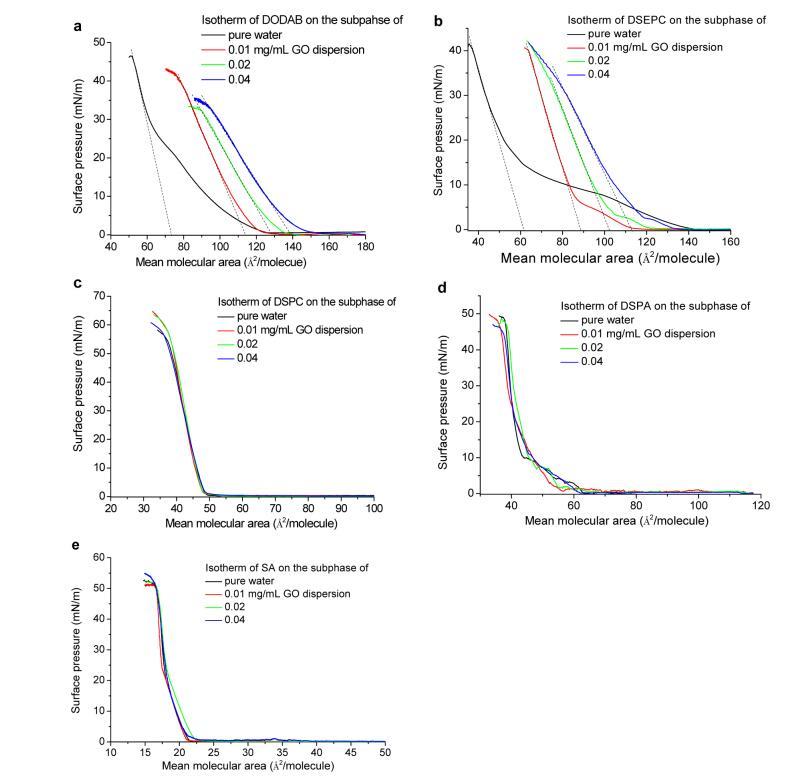 图1显示了表面压力−纯水和GO水分散体亚相(0.01、0.02和0.04 mg/mL GO)上带正电的DODAB(a)和DSEPC(b)、带中性电荷的DSPC(c)、带负电的DSPA(d)和SA(e)的面积等温线。