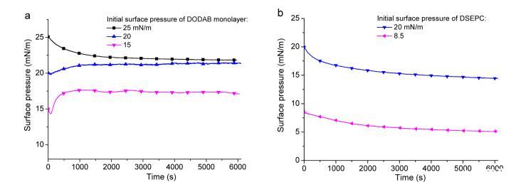 图4.GO在不同表面压力下对(a)DODAB和(b)DSEPC单层的吸附研究(表面压力与经过时间的关系)。首先将单层压缩至纯水亚相上的一定表面压力,然后小心地将600μL 1 mg/mL GO分散液缓慢注入单层下方的水亚相。