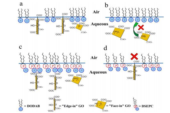 图3.GO在空气中并入DODAB(a,b)和DSEPC(c,d)单层时可能的方向示意图−水界面。