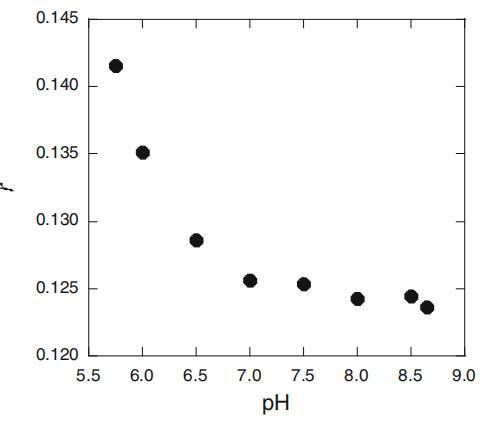 图8:若丹明B在SLAS胶束(r)处的荧光各向异性与CS=25mM时pH的关系图