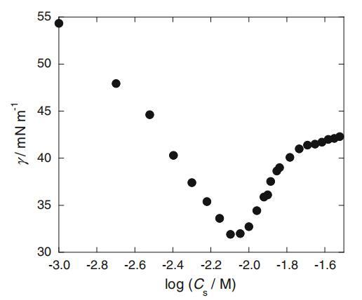 在图1中,仅含SLAS且不含任何缓冲液的水溶液的界面张力(γ)与总SLAS摩尔浓度(CS)的对数作图。如图所示,尽管SLAS仔细重结晶,但γ值出现了异常的最小值。然后,样品溶液的pH值在浸渍底部约为5.5,并随CS增加至约8。由于此浸渍应是由取决于SLAS浓度的pH变化引起的,因此所有实验均在磷酸盐和硼酸盐缓冲液控制的恒定pH下进行。则图1中观察到的下降在每个值的受控pH下完全消失(见图2)。cmc后,pH 5.5下的γ值略有增加,因为样品溶液的pH因其缓冲容量的限制而缓慢增加。在1.0mM(胶束前浓度)和25mM(胶团后浓度)的恒定CS下,γ值相对于pH值绘制在图3中,其中还绘制了十二烷基硫酸钠(SDS)的结果作为对比示例。与SDS相比,非常有趣的是,当pH值低于约7时,SLAS的γ值显着降低。接下来,图4中绘制了cmc和C20(其γ值比纯水的γ值降低20 mN/m时的表面活性剂浓度)与pH的关系图。这两个值在较低pH值区域也降低,尽管SDS的pH值不随pH值而变化(数据未显示)。此外,如该图中cmc/C20比率的曲线图所示,这些比率在pH值小于7.3的区域内增加。该比率的增加通常意味着亲水性头基的尺寸增加和/或表面活性剂的反离子与头基的结合更紧密[11]。