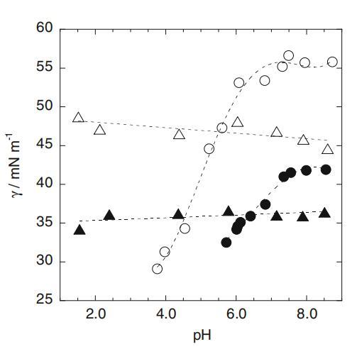 图3 CS=1.0和25mm时界面张力(γ)与pH的关系图:白色crcles 1.0mm SLAS,白色三角形1.0mm SDS,黑色圆圈25mm SLAS,黑色三角形25mm SDS