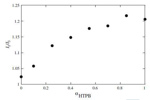 图7 HTPB+Mega-10混合体系中芘荧光强度的I1/I3比与αHTPB的关系图