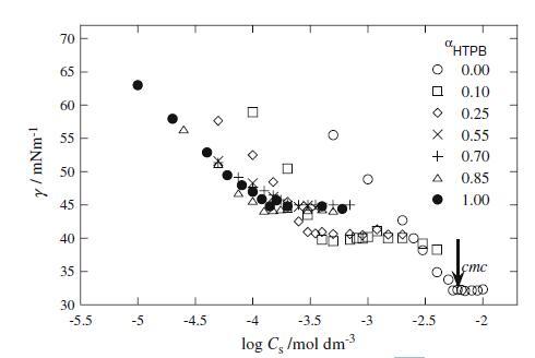 图1界面张力γ与log Cs/mol dm的关系图−3.对于HTPB+Mega-10混合体系,在不同α