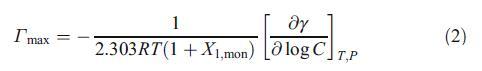 其中γ、C、R、T、P和X1、mon分别为界面张力、表面活性剂浓度、理想气体常数、温度、压力和阳离子表面活性剂(HTPB)的单层组成。在等式2中,XVDEVIOS官方下载免费版考虑了界面处反离子的吸附,以计算Γmax。界面上表面活性剂物种占据的平均最小面积Amin然后通过以下方程进行评估: