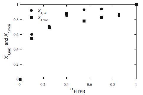 图3 HTPB+Mega-10混合体系的胶束(X1,mic)和单层(X1,mon)组成与αHTPB的关系图