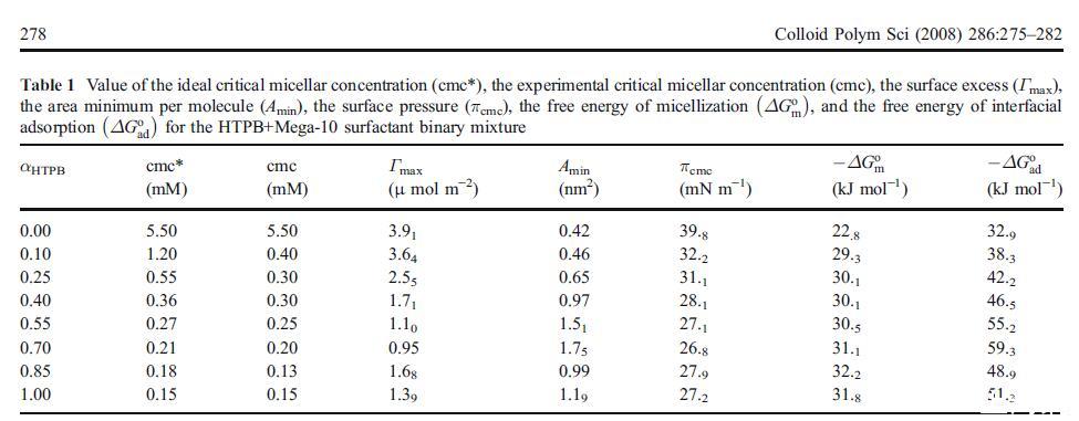 在该方程中,πcmc是cmc下的表面压力,由γ0给出−γcmc,其中γ0和γcmc分别是溶剂和胶束表面活性剂溶液在cmc处的界面张力。ΔGo ad值计算并列于表1中。然而,ΔGo m和ΔGo ad值均为负值,表明这两个过程都是自发的。