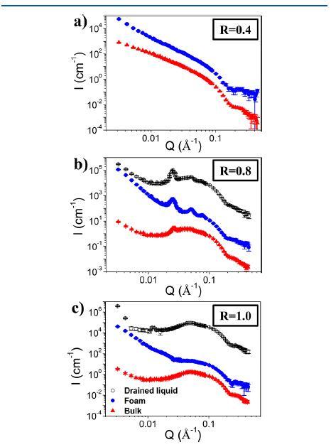 图2:对于(a)R=0.4,(b)R=1.0和(c)R=2.0,散装溶液(红色三角形)、泡沫(蓝色圆圈)和排出液体(黑色空圆圈)的SANS光谱。为清晰起见,将光谱强度相互偏移了100倍。