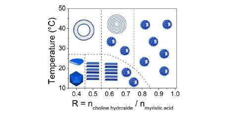 图1.氢氧化胆碱/肉豆蔻酸体系整体相行为的示意图,作为R和温度的函数,根据参考文献30的先前研究确定。