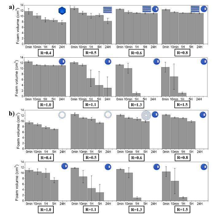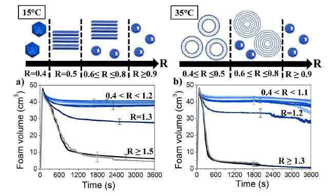 图5:在两种温度下(a)15°C和(b)35°C下,通过手摇动不同摩尔比(R)产生的泡沫体积随时间的变化。示意图表示作为R和温度的函数的大量自组装体。