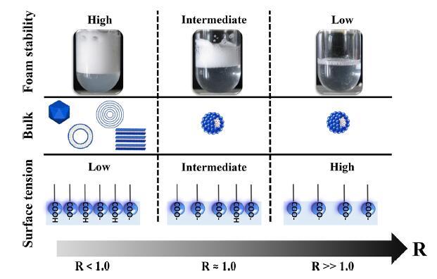 图6.说明摩尔比(R)、泡沫稳定性、本体自组装和表面性质之间联系的示意图。