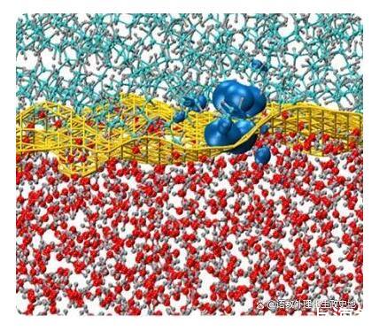 大多数DFT模拟的计算要求通常与电子数的立方成比例。但对于具有大带隙特性的绝缘系统,仅线性扩展的DFT技术可用于研究电子结构。利用这种方法,哈桑纳利和他的同事在纳米尺度上模拟了由数千个原子组成的疏水界面的电子效应。下图显示了模拟的油水界面。